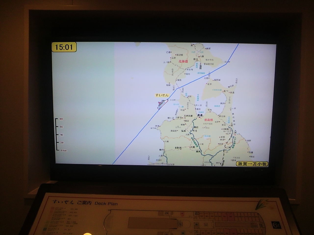汗もかなりかいたので、大浴場にて昼風呂に入りました。露天風呂からは、ちょうど津軽海峡を通過しているので、津軽半島が見えます。露天風呂に入りながら、一緒に入っていた50代の男性と盛り上がってしまいました。男性曰く、ホテルみたいで露天風呂に入れて最高との事。