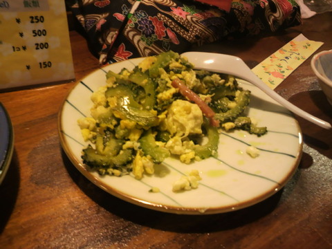お酒は生ビールから泡盛のうっちん茶(ウコンのお茶)割りにチェンジしました。最後に、よもぎの天ぷらとナーベラー(へちま)チャンプルと豆腐ようで〆ました。これで1人3500円で済んだのは、上出来だと思います。