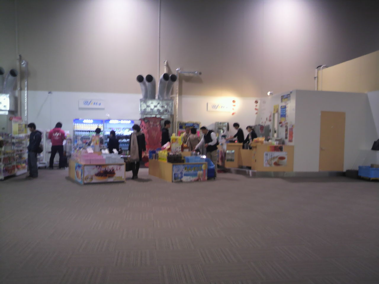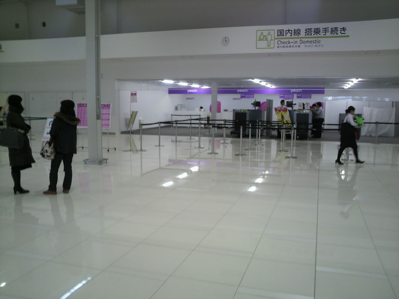 すぐに手荷物検査を通り中に入ると、倉庫のままのガランとした空間にイスが並べられ、待ち合い室になっています。はしっこに売店がある以外何もありません…。つくづく、ジャスコのフードコートで昼食を食べてよかったと実感しました。
