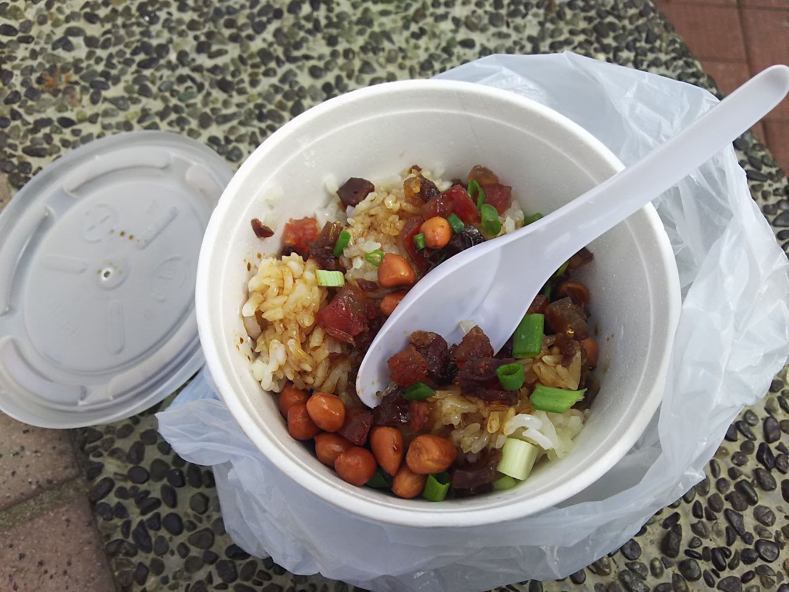 中環到着後、長州島フェリーターミナル内の軽食コーナーで、昼食を買って食べました。メニューが全て中国ごでわかりません。結局、適当に頼んだのは、木の実等の具材と甘い醤油ダレがかかった御飯で、30HKD(450円)でした。不味くはないですが、食べた事が無い味付けでした。
