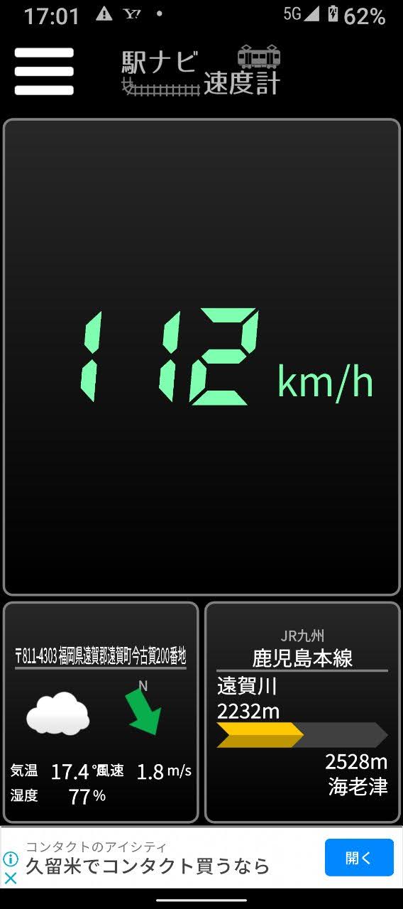 折尾を16時56分に発車後、列車は遠賀川を渡ります。小倉から戸畑・黒崎・折尾と停車し、車内は満席状態が続きます。列車は田園地帯を爆走し、速度アプリで計測すると、時速110キロ前後出ています。