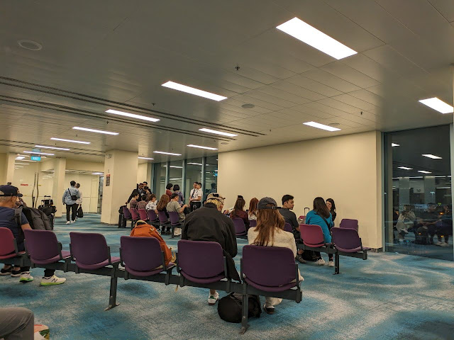 深夜0時10分頃F41ゲート待合室入口で、保安検査が始まりました。保安検査と搭乗券チェック後、待合室に入ります。これから1時20分発シンガポール航空SQ656便福岡空港行に搭乗します。待合室内は、日本人が非常に多いです。なお保安検査通過後の待合室には、トイレがありません。