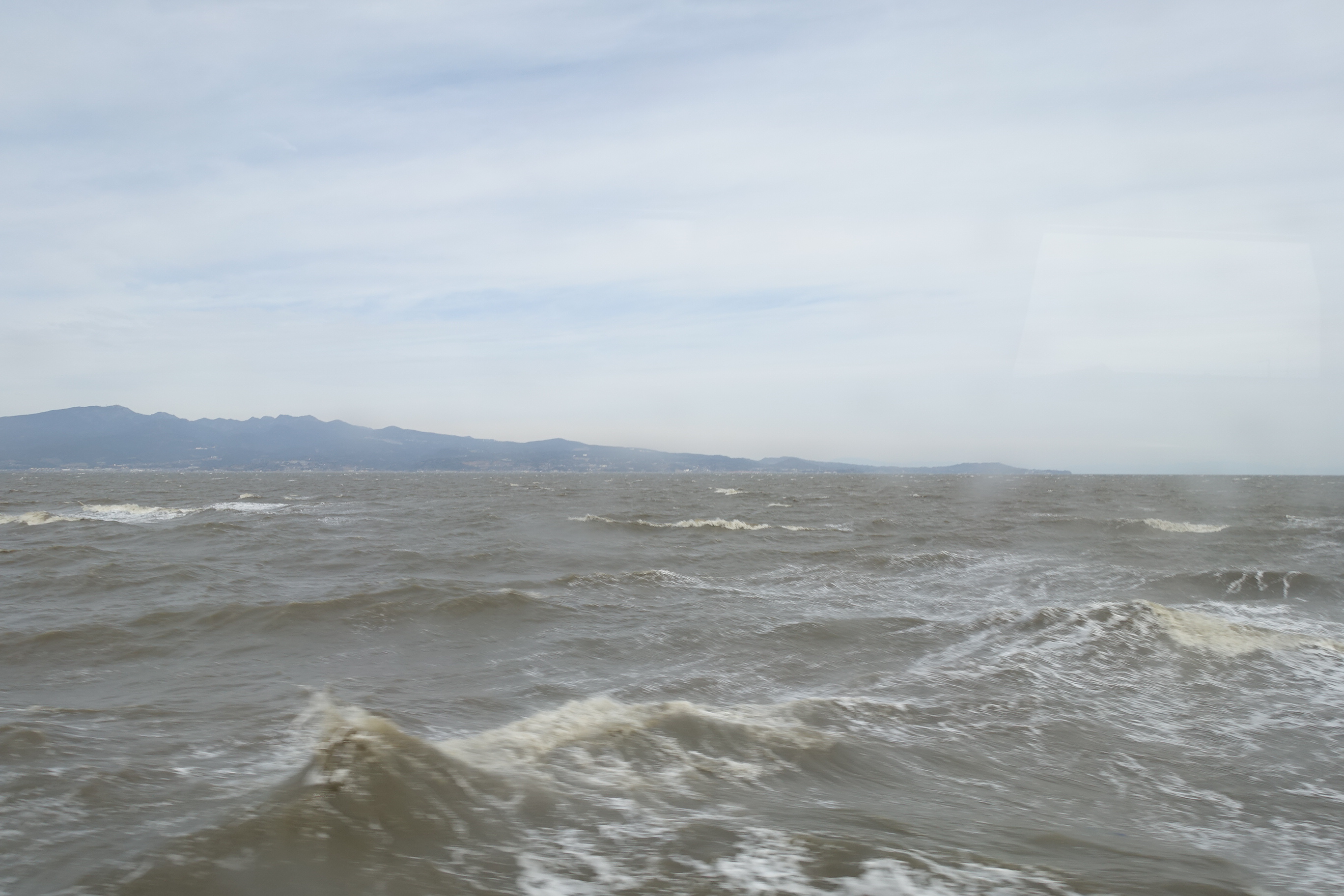 愛野発車後、車窓からは有明海が見えます。天候が悪く内海のせいか、茶色く濁った泥海です^_^。実は諫早〜多比良間は、約20年以上ぶりの乗車だったりします。
